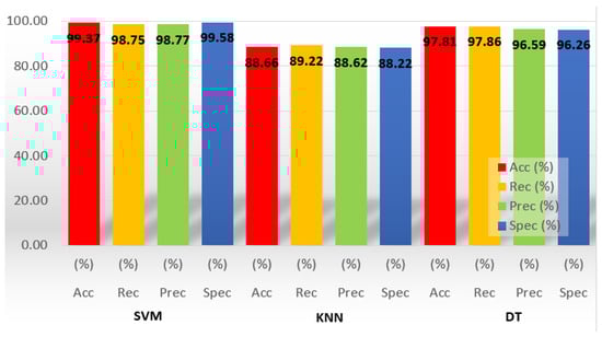 Table 4 shows the results of the classification metrics (Equations (5)–(9)) using the SVM, KNN, and DT models. Meanwhile, Figure 10 shows the performance comparison of the average results of the different models. The SVM model demonstrates an excellent balance between sensitivity and specificity, as shown by the comparatively low numbers of false positives and false negatives. The SVM model achieves the best results, with an accuracy of 99.37% and a precision of 98.77%. This application of SVM for crack location in wind turbines has shown promising results. The model effectively and accurately classifies different conditions, facilitating the precise location of various transverse cracks using a limited dataset and minimal computational power. It excels in classification tasks and effectively manages complex patterns within the data. This approach enhances safety and operational reliability while also contributing to cost savings by reducing unplanned maintenance.