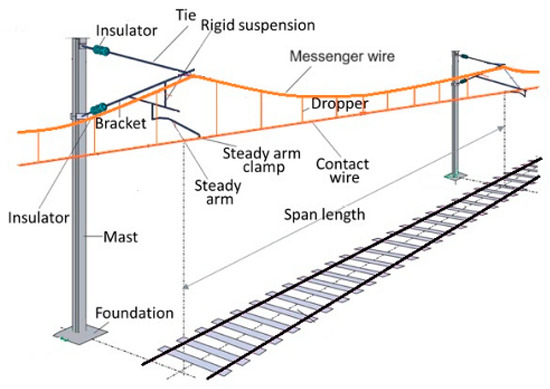 An overhead contact line (OCL) is a key component of the railway infrastructure’s energy subsystem, supplying electrical power to the motors of electric trains. The main components of an OCL include a contact wire (CW), which is suspended to the messenger wire (MW) by a series of droppers spaced along the line. The MW is supported by suspensions attached to structures such as poles or portals, typically at intervals of 50 m to 60 m. Each suspension consists of a frame, insulators, and a steady arm, with the latter imposing the lateral position (stagger) of the CW. Figure 1 reports a schematic of an OCL with its main components.