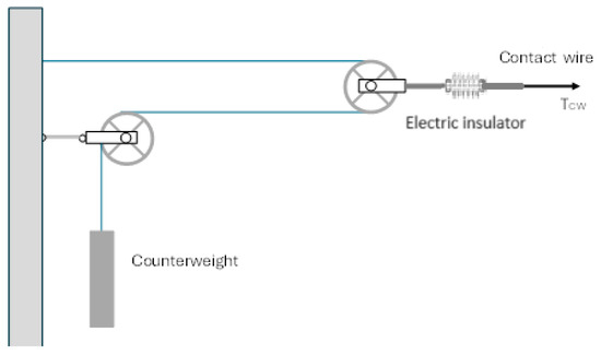 General view of the scheme of the half regulation of the OCL. The fixed point section (left side) realizes a longitudinal restrain for the conductors. Mechanical tensions are applied by means of the constant forces at the regulation’s ends.