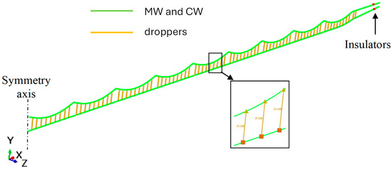 A finite element model was created using Abaqus® 2022 version, where beam elements are adopted to represent the conductors and insulators while connectors were used to model the droppers to simulate their slackening during the dynamic transient following the breakage of the CW. Only one half of the regulation OCL has been modeled, and the symmetrical boundary conditions have been considered. The model, shown in Figure 3, consists of 420 nodes and 412 B31 beam linear elements to model the CW, MW, and insulators according to the detailed cross-sections reported in Table 2. To model the droppers, 83 nonlinear axial connectors, 1 for each dropper, have been used as shown in the detail of Figure 3. These axial nonlinear connectors are defined by the initial un-deformed distance between the two connected nodes; the first node is on the MW and the second node is on the CW. If the distance decreases, the connector exerts no reaction force, corresponding to the dropper slackening, while an increasing distance results in a reaction force proportional to the dropper’s axial stiffness. This model allows for a simple yet effective representation of the dropper’s behavior under tension and relaxation. The current model does not account for the stagger, or the zig-zag arrangement, of the OCL conductors.