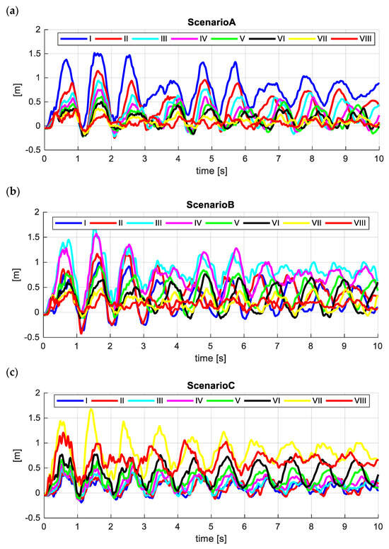 Vertical displacement of the CW at each midspan of the considered span in the numerical model (numbered from I to VIII), following the CW breakage: (a) Scenario A, (b) Scenario B, and (c) Scenario C.