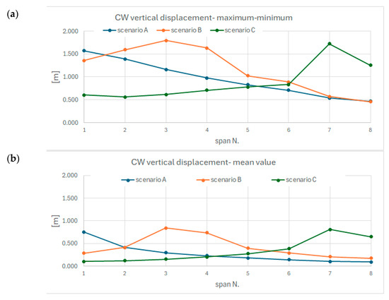 - The maximum amplitude occurs in the span involved in the CW rupture and, for scenarios B and C, also in the adjacent spans, as shown in Figure 7a, reporting the difference between maximum and minimum vertical CW displacement along the span, assumed as p–p amplitude. The latter is about 1.8 m, corresponding to a roughly 3% of the span length.