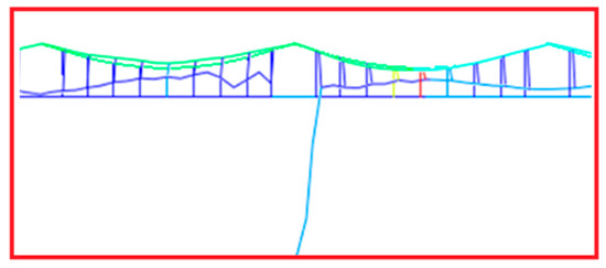 The first key detail focuses on the CW breakage, as shown in Figure 8, where only the deformed configuration is shown. The vertical component of the displacement is amplified for highlighting it, along with the vertical dimension. The axial load on the CW between the rupture section and the central fixed point becomes zero as no axial load is applied. Meanwhile, the axial load applied by the loading devices at the regulation is progressively transferred from the CW to the MW through the droppers. These droppers, instead of remaining vertical, take on an inclined configuration, as illustrated in Figure 9. Similarly, in the area close to the tensioning setup, the droppers appear inclined (see Figure 10) due to the progressive transfer of the axial load from the CW to the MW.