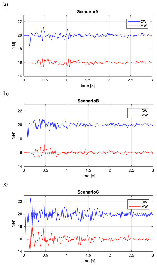Axial load of the CW and the MW following the CW breakage: (a) Scenario A, (b) Scenario B, and (c) Scenario C.