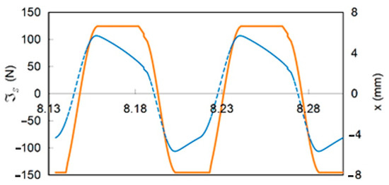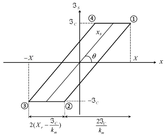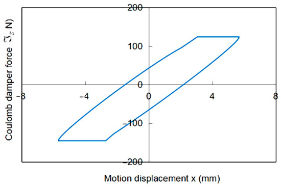 In the analysis of Wang and Chen [5], turbine blade damper was developed with Maxwell–Coulomb (MC) arrangement. Our turbine blade model is simulated using four different cases of stick–slide motion. This allows extensive analyses of this highly nonlinear motion to be uniquely conducted. Its system parameters are as follows: , , and excitation force , at resonant . For the MC damper, the stiffness ratio of its Maxwell spring is ; = 0.69; . Using the CD method, a MATLAB ODE45 solver is programmed to simulate its system responses. From its hysteresis loop, shown in Figure 6, one discovers that it is closely correlated with Figure 3 and the theoretical results. For its displacement by Equation (7), X = 5.8 mm, while the simulation displacement from the figure is 5.7 mm. Thus, the percentage error is only −1.3%. Then, the simulated transmissibility = 0.610. From Equation (31), its denominator varies between to . Here, a simulation factor is implemented in the denominator as . When = 0.53, the percentage error is −1.9%. For the damper force comparison, the simulated = 140N. Meanwhile, the theoretical = 149N, being −5.9% larger. The displacement ratio of stick–slide motions is computed from Figure 3 as = 0.212. The simulated = 0.238, with +12.2% error, and the simulated = 0.238, with +12.2% error. Hence, the simulated motion is fully complied with theoretical cases A to D. Hence, the accuracy of the CD method is fully validated on this blade model.