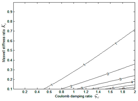 where is Coulomb damping ratio, is Maxwell spring stiffness ratio. Two complementary solutions can be obtained from this equation, namely “minus” and “plus” solution in the denominator. From the “minus” solution of Equation (31), the singular point to avoid is . When singularity occurs, this solution is complemented by the “plus” solution under nonlinear minimum transmissibility condition [11]. Compared with rigid Coulomb damper, this condition is additional. Therefore, the singularity problem is eliminated in this model. The “plus” and “minus” solutions of Equation (31) can be plotted in the following three global zones: