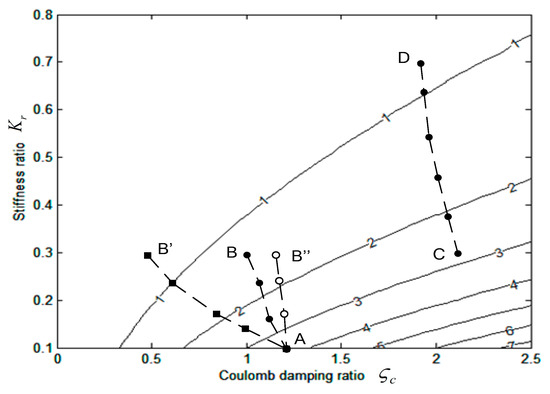 Using these performance trends and the maximum amplitude approach, resonant transmissibility contours are generated in the ranges [0, 2.5], [0.1, 0.8], as seen in Figure 9. The design paths of three developed optimal methods are generated and plotted as dotted curves with black squares and circles to compare their applicability. In the lower range of , the first path starts from point A, where = 3.26 and . For the CDNS method, its design curve converges rapidly in three searches to point B, with = 1.21 bounded at = 0.3. The reduction in is 66%. Its increase in is the fastest, from −168 (positive definite) to 0.579 (negative definite). Then, design curve of the CDGS method converges in four searches to B’, with = 0.836. The reduction in is 83%. increases from −253 to −5.63, remaining positive definite. For the CDGN method, the design curve converges vigorously in three searches to B″, when = 1.30. The reduction in is 56%. Its decrease from −253 to −18.8, remaining positive definite. Thus, the fastest increase occurs in the CDNS method. For the comparison in , the reduction percentages are in the following order: CDGN (4.17%); CDNS (16.7%); CDGS (62.5%). As CDNS is situated in the middle of and reduction, it offers the best compensation among these methods. Hence, the CDNS path is established in the upper range of . It converges convexly from C, with = 2.72 at = 0.3. Then, in five steps, it is bounded at D, where = 0.7, with = 0.848. Reductions in and are 9.52% and 68%, respectively. Both cases using the CDNS method illustrate that when sufficient reduction is engaged, reduction can be much enhanced in this Maxwell arrangement. Simultaneously, is lessened mildly in the second path due to the initial position. These paths allow the designs in global ranges to be made up effectively in a few steps.
