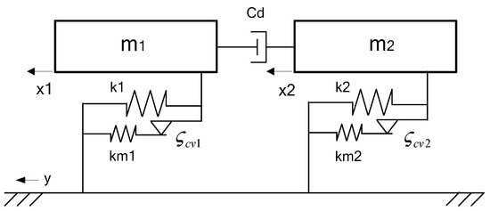 In seismic response design [7,8,9], adjacent buildings between a single-story tower (m1) and a single-story podium (m2) are modeled as linear shear types and connected by a viscous damper. Its mass–spring–damper model with an MC damper is 2DOF, as demonstrated in Figure 10. According to the structural parameters of Chen and Wu [9], m1 = 3.63 × 105 kg and . Meanwhile, the damping parameters are given by Bhaskararao and Jangid [7] as , where are their viscous damping ratios, and , where . Assume that and are the mass and frequency ratios between adjacent buildings. Their ratio parameters are