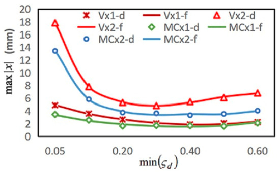 Substituting , where and , in Equations (17) and (18) form the loop motion equations. Then, viscous ODE Equations (39)–(41) are transformed to MC ODE by these equations. Utilizing their solutions, the maximum displacement curves are generated, as shown in Figure 11. Under different resonant frequencies close to their system resonance, damping parameters are generated, as shown in Table 1.
