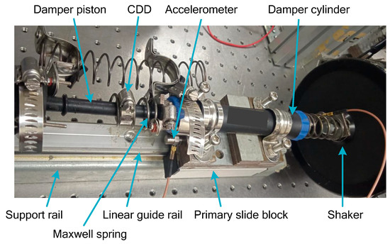 A vibration test is carried out on the prototype damper system to experimentally validate the previous analysis, with and at frequency , a condition that is very close to its resonance. The prototype is of a piston–cylinder type, which is well connected to the adjustable Maxwell spring and Coulomb damping device (CDD) [15]. A linear slide block platform is established for the linear horizontal motion of this system, consisting of slide blocks, a linear guide rail, and a support rail, as shown in Figure 12.