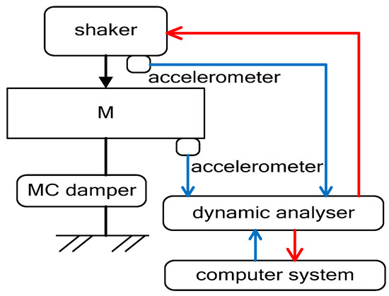 where y is the shaker displacement, is the shaker spring stiffness, and y − x is the shaker–damper relative displacement. An equipment schematic of the prototype test is illustrated in Figure 13. Vibration signals on slide block and shaker are captured by accelerometers. These signals are conditioned at the spectrum analyzer.