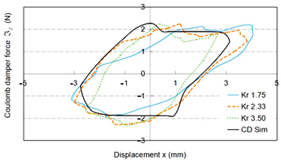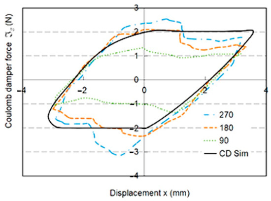 In this line fitting of the Coulomb force test, the line slope = 6.81 × 10−3 N/degree and the line constant . Meanwhile, hysteresis loops at medium = 180° from the CD simulation and experiment are compared in the figure, as they represent the common experimental features. From this comparison, their motions are seen to be close to each other. Simulation loop energy 0.0317 J displays a 5.11% deviation from the experimental value. For the Coulomb damping force, is found in the simulation, which is 8.8% deviated from the experimental measurement. Compared to the experimental sliding motions under this force, they are slightly inclined. This is caused by the flexural stiffness of the rubber friction plate inside the CDD.
