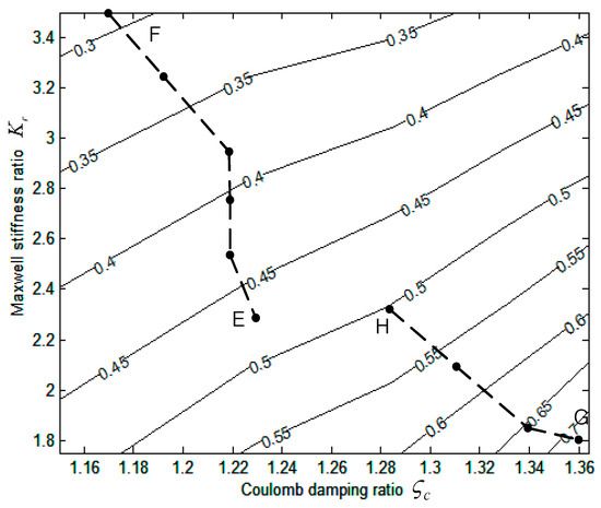 To check the applicability of this plot in local ranges [1.15, 1.36] and [1.75, 3.50], design paths are established using CDNS. In the lower range of , the first design path starts from E, where = 0.465. A Maxwell three-coil spring is used, with a stiffness ratio of = 2.33. Meanwhile, is turned to 135°, and = 1.23, as obtained by Equation (50). Using the CDNS approach, its design path is shown as the dotted curve with black circles from E to F. It converges from E in five steps to F, with = 0.292 bounded at a two-coil spring, with = 3.50. is minimized to 100°, with = 1.17. Reduction in is 69%. Due to the constant curvature of the contour in separate ranges, the pattern of varies linearly. Meanwhile, increases vigorously from −21.0 to −2.74, indicating that the increase is significant. Hence, the CDNS approach is accurate and effective in these experimental ranges.
