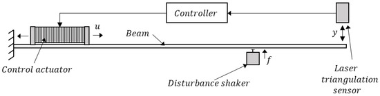 where , , and k represent the modal mass, damping, and stiffness, respectively, is the displacement at the tip, is the disturbance force, and is the control force applied via the piezo actuator. The system model is described by a linear time-invariant (LTI) second-order state-space system according to