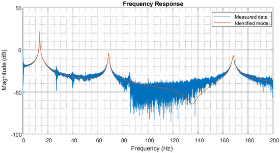 The control input represents the voltage applied to the actuator, which generates a control force at the base of the beam. The disturbance input represents an external force applied to the beam tip, simulating an impulse excitation. The output is the measured displacement at the beam tip, obtained from the laser triangulation sensor. Matrices , , and are the state transition matrix, control input influence matrix, disturbance influence matrix, and output matrix, respectively. The linearised model capturing the dynamics of the beam between actuator voltage and tip displacement can be obtained by experimental means. A chirp signal with a frequency range of 1 Hz to 200 Hz and amplitude of 1 V peak to peak was applied over 300 s to the amplifier which drives the stack actuator. The system frequency response is shown in Figure 2. The figure shows three resonant frequencies in the frequency range of the test, located at , and . The impulse response of the disturbance from the shaker was recorded to deduce the disturbance model. The MATLAB v23.2 ‘ssest’ function, which uses a prediction error minimisation algorithm, was utilised to create the system model for the first bending mode in the observer canonical form given in Equation (4).