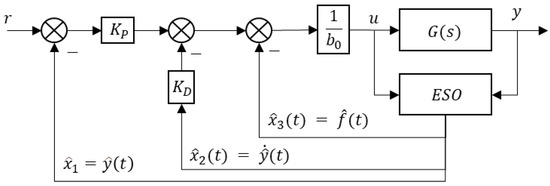 With the system states and total disturbance estimated by the observer, the dynamics are effectively simplified to that of a double integrator, allowing the output to be regulated using a conventional controller. A simplified PD controller, which uses only the output derivative in the derivative term and omits the derivative of the reference signal is used. This approach avoids the amplification of noise or unbounded values that can arise from differentiating sharp reference inputs such as steps or impulses. The resulting control law is an estimation-based state feedback controller: