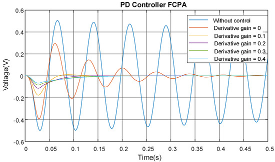 This section presents the results of control simulations for the active cantilever beam. FCPA capabilities are investigated for an arbitrary PD controller with a fixed proportional gain of 1 and varying derivative gain values (0, 0.1, 0.2, 0.3, and 0.4). The derivative term provides a damping effect by predicting the future behaviour of the error based on its rate of change. When the error changes rapidly, the derivative action generates a control signal that opposes this change, thereby dampening the oscillations. The ADRC tuning parameters are chosen to set the closed-loop system eigenvalues sufficiently far to the left of the system open-loop poles to increase damping, restricting the first-cycle peak. The closed-loop system poles are chosen as 20, 40, 60, 80, and 100 times the real component of the open-loop system poles. The observer poles are placed at six times the controller bandwidth . Simulation results are obtained using the MATLAB/Simulink PID and ADRC block, and the FCPA is calculated in percentages as