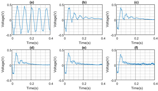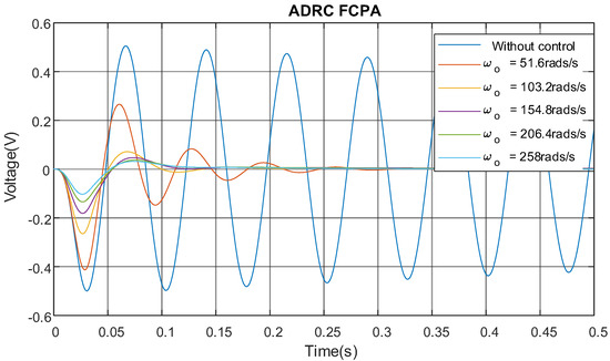 With a derivative gain of 0.3, the vibration amplitude was 0.16 V, though an FCPA of 11.7% was achieved. The derivative gain of 0.4 resulted in a vibration amplitude of 0.2 V and amplification of the first-cycle peak by 200%, according to Figure 8f. In contrast, the ADRC achieved up to 30% FCPA when the observer bandwidth was set at 258 rad/s and the controller bandwidth at 43.03 rad/s.