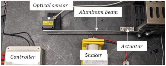 The smart beam, constructed from aluminium alloy (Young’s modulus: , density: ), featured a piezoelectric stack-type actuator (Physik Instrumente, GmbH, model P-888.91) capable of generating a blocking force of 3800 N within a 0 to 100 V range. Actuators were controlled using a BCP303 Thorlabs amplifier with adjustable gain settings (7.5, 10, and 15). Beam tip deflection was non-contact measured via a Riftek RF603 laser triangulation sensor, providing a 0–10 V analogue signal indicative of deflection. Control algorithms were implemented using a Texas Instruments F28379D development board and MATLAB/Simulink. Signal conditioning circuits were designed to scale signals within the 0–3 V input–output range of the controller. Data acquisition utilised National Instruments hardware and software. Tip disturbance was induced by a simple electromagnetic shaker, driven by a pulse signal from a function generator. Figure 6 depicts the assembled setup.