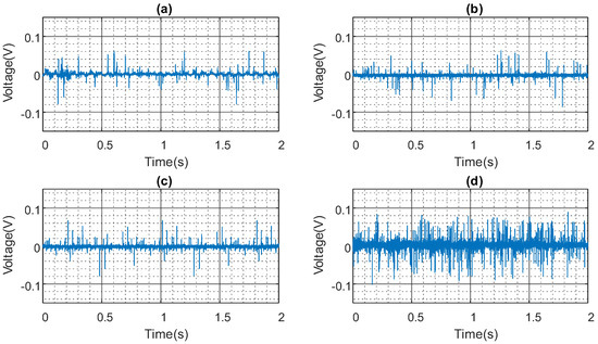 ADC noise: (a) 1 kHz sampling frequency; (b) 2 kHz sampling frequency; (c) 5 kHz sampling frequency; (d) 10 kHz sampling frequency.