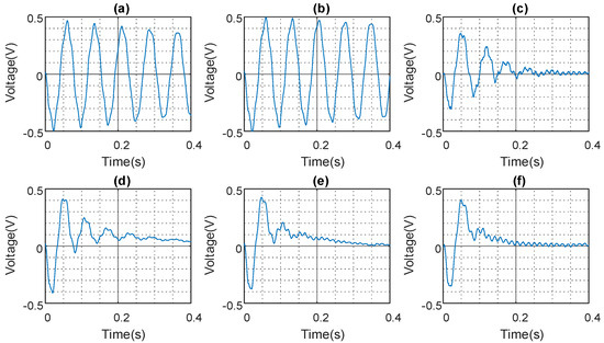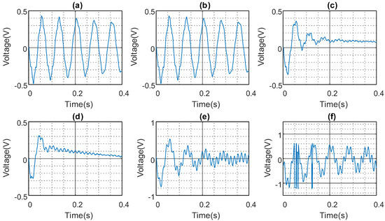 An observer bandwidth of 344 rad/s resulted in a spillover vibration amplitude of 0.28 V and first-cycle peak amplification of 56%, as observed in Figure 12e. An observer bandwidth of 430.3 rad/s resulted in a vibration amplitude of 0.7 V and amplification of the first-cycle peak by 150%, according to Figure 12f.