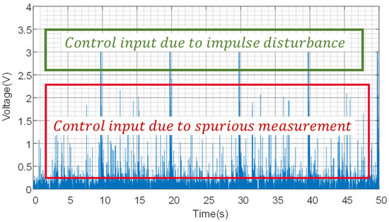 The profile of the control input signal which drives the actuator is shown in Figure 13. It is observed that the control input is a combination of the intended response to the impulse disturbance and a spurious response due to sensor noise, which is amplified based on the value. When these high-amplitude responses occur in succession, they combine with the system delay to cause spillover.