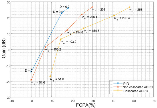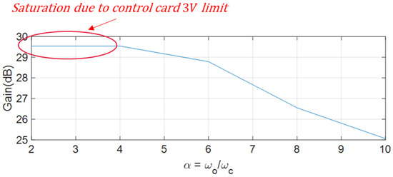 Figure 14 shows the noise amplification that results from FCPA across different controller gain settings. An analysis of the noise amplification in PID and non-collocated and collocated ADRCs reveals that the non-collocated ADRC achieved 12% more FCPA than the PID controller and the collocated ADRC achieved 18% more FCPA than the non-collocated ADRC. To investigate the recommended / ratio of between three and ten, the observer bandwidth was held at its optimal value of , while was varied to extract the control signal. The results are shown in Figure 15. Due to the 3 V control card saturation limit, it was not possible to deduce the mathematical relationship between and noise amplification. However, as this is an introductory investigation into the effect of this ratio, the results provide a springboard for further research.