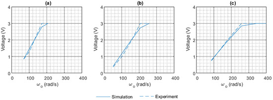 Controller input voltage peak relationship in simulation and experiment for different values. (a) . (b) . (c) .