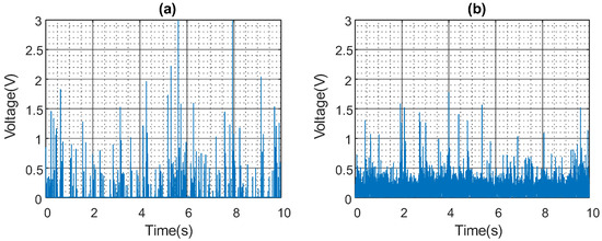 Figure 7 illustrates the contribution of ADC noise for varying sampling frequencies. Notably, while noise peaks occur at similar levels (approximately 0.1 V max) across different sampling frequencies, higher sampling frequencies exhibit more frequent spikes and a larger noise floor. Consequently, a sampling frequency of 1 kHz emerges as the optimal choice due to its superior performance in minimising the occurrence of spikes.