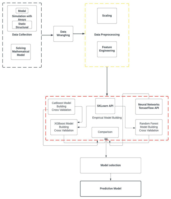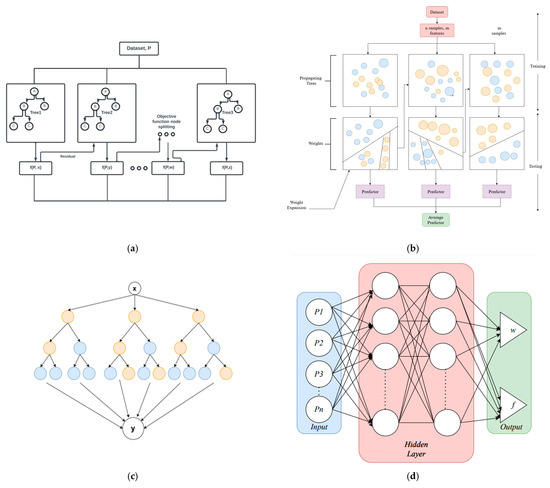 Architecture of the machine learning models used in this study: (a) Random Forest; (b) XGBoost; (c) CATBoost; and (d) Artificial Neural Network. These models were selected to explore a range of regression methods for predicting vibrational and frequency responses under varying physical parameters.