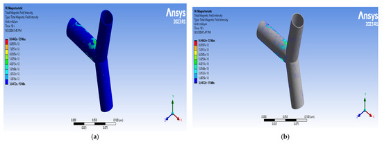 The following assumptions underlie the development of this thermo-fluidic model: a low diluted mixture, a time-invariant gradient of nanoparticle volumetric fraction, and a Newtonian, incompressible fluid with a uniform magnetic field specified. Additionally, we see that the diffusion of the mass flux term and transient and inertia terms are neglected here. Based on these assumptions, Equation (1) remains unchanged, and Equations (2)–(4) reduce to the following: