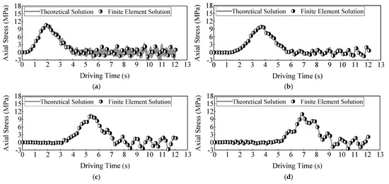 Vehicle-induced deformation of the bridge deck is the direct cause of tensile bending deformation in the suspenders. To clarify the correspondence between internal force and deformation for the short suspender under the vehicle-induced tensile bending effect, separate analyses were performed on the relationship between the short suspender’s axial force and bending moment and its axial stretching and rotational deformation. During vehicle crossing, the anchorage end of each suspender undergoes deformation to varying degrees. Based on the axial relative deformation between the upper anchorage end and lower anchorage end of each suspender, combined with physical and mechanical parameters such as the suspender length, force-bearing area, and elastic modulus, the theoretical time-history solution for the axial force of each suspender under vehicle-induced vibration was calculated through constitutive relations of suspensers. Concurrently, the finite element results for the axial force of LINK element suspenders under vehicle loading were extracted. The finite element results coincide with the theoretical solution, as shown in Figure 12. This indicates that the axial relative deformation, resulting from the collective vibration of the arch rib connected to the upper anchorage end of the suspender and the transverse girder connected to the lower anchorage end, transmits axial alternating load within the suspender.