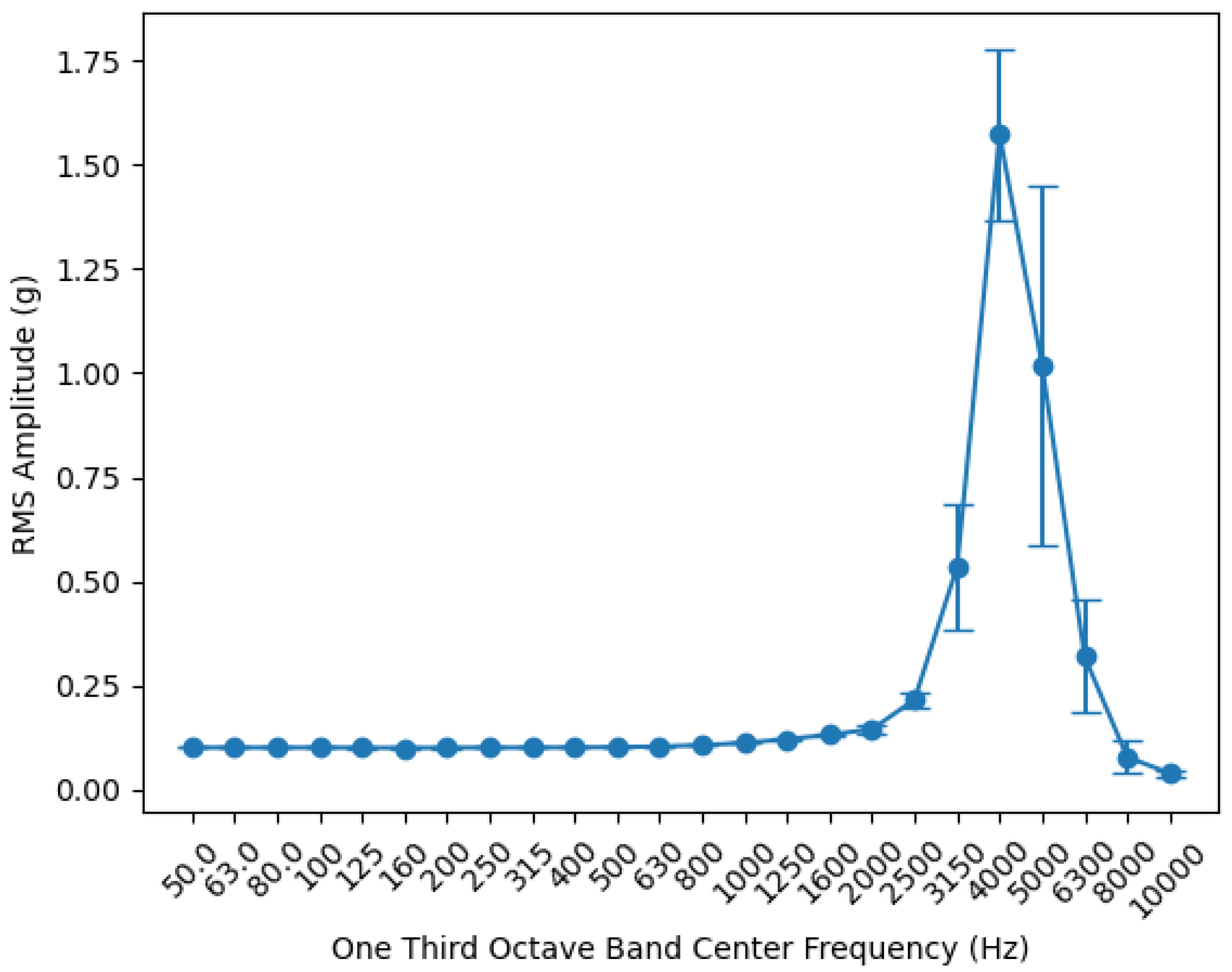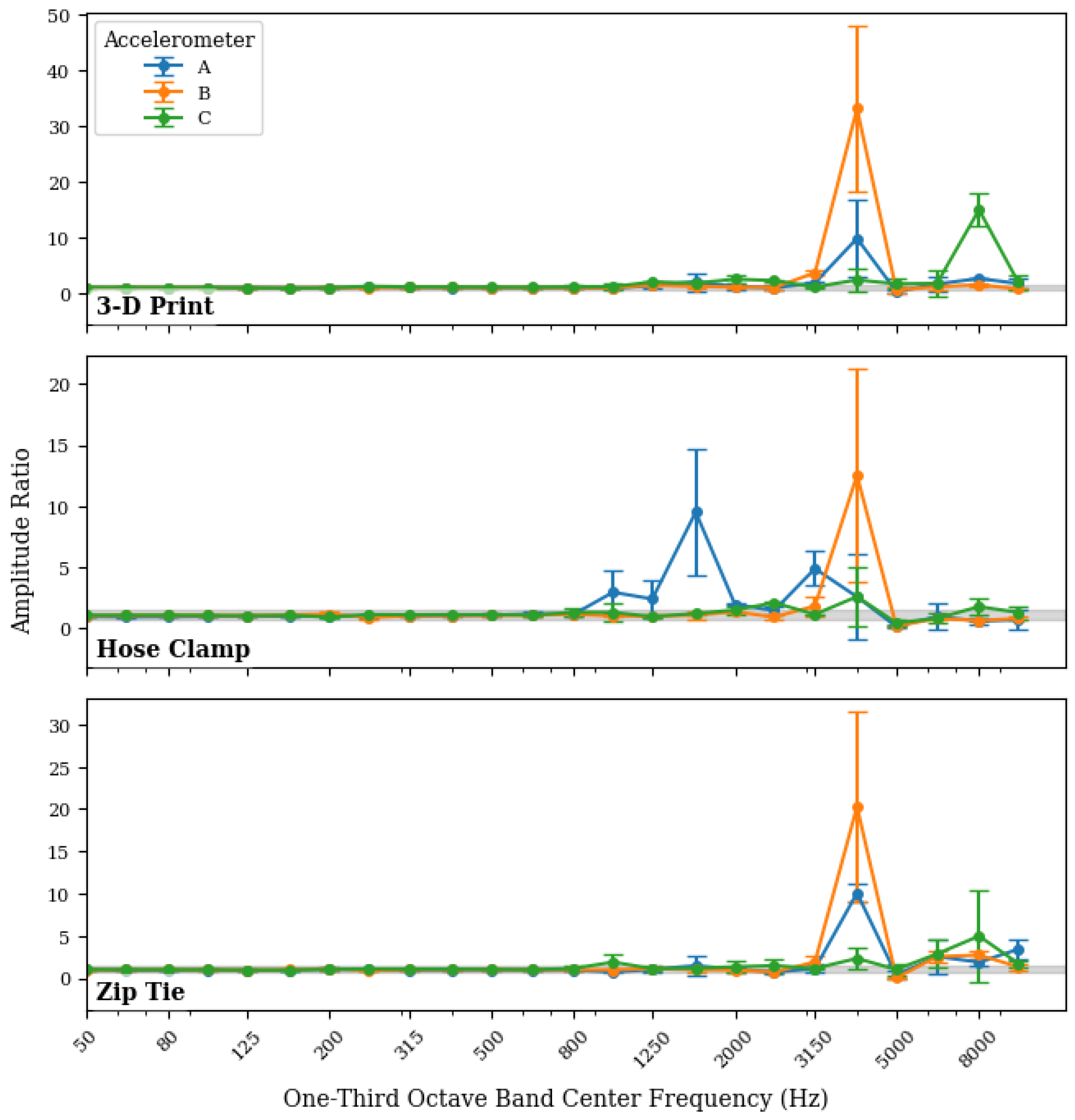 Mounting Method | Accelerometer | Highest Third Octave Band Center Frequency Prior to Exceeding Threshold (Hz) | ||
