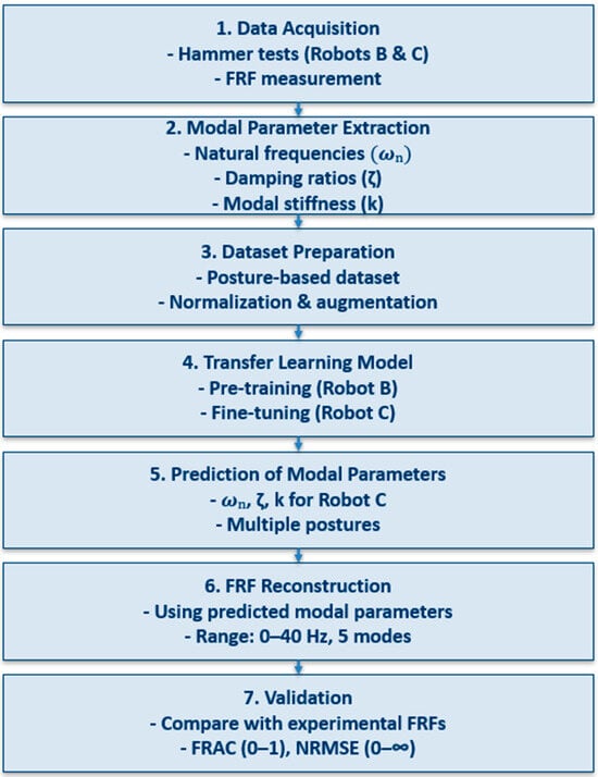 In our previous work [69], a deep learning-based framework was presented to predict the modal parameters of a KUKA KR-300 robot manipulator (Robot A). Due to the posture-dependent nature of robot vibrations, an extensive experiment was carefully designed, comprising hammer tests in 254 robot configurations. Modal parameters in each robot configuration, including natural frequencies, damping ratios, and stiffnesses, were extracted to form a dataset. The challenges in selecting frequency peaks (modes) from FRF data during modal analysis and the proposed four-step method to accurately target them and extract modal parameters were explained in the reference [69]. The created dataset was used to train a feedforward neural network capable of accurately predicting these modal parameters in previously unseen robot configurations quickly. The predicted values were then used to estimate Frequency Response Functions (FRFs), which showed strong agreement with experimental results. A flowchart summarizing the complete methodology is presented in Figure 1, showing all steps from data acquisition to validation.
