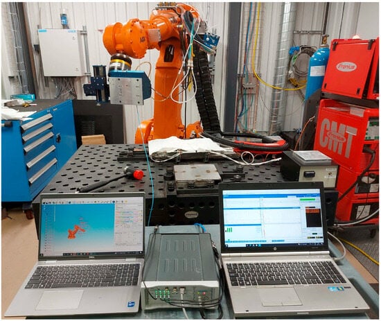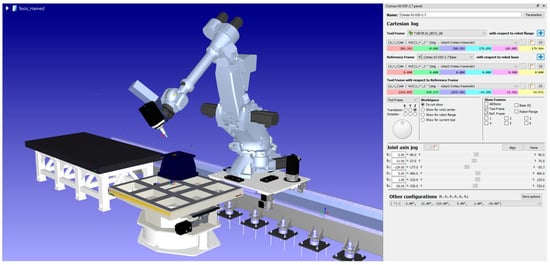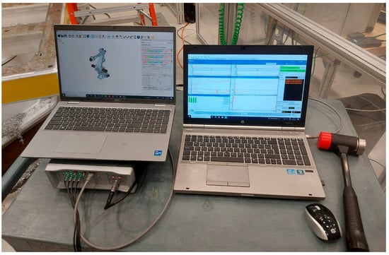 To perform the hammer tests, we used a set of precise measurement instruments. The setup included the LMS SCADAS Mobile data acquisition system connected to Siemens LMS Test.Lab software (Simcenter Testlab 2306) (Figure 5). A modal impact hammer (model 086D20) was used to excite the robot structure, and a triaxial accelerometer (model PCB HT356A43) was attached to the robot’s tool (end-effector) to record vibration signals in three directions: X, Y, and Z. The acceleration data was sampled at 1024 Hz with a frequency resolution of 0.25 Hz. The time of collecting the signal for each test was 4 s, and the number of impacts per test was 5 to have a reliable signal. This setup ensured that we captured detailed information about the robot’s dynamic behavior.