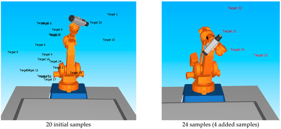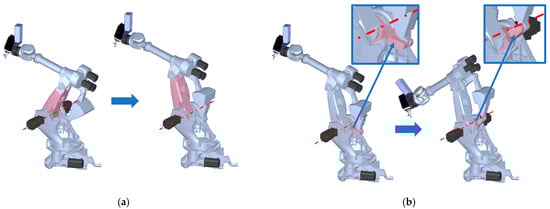 For this study, new experiments with a reduced number of tests (robot configurations) were designed for two robot candidates: Robot B and Robot C, in alignment with the study’s objective to minimize testing time and effort. Accordingly, only 25 postures were selected for Robot B and 29 (25 + 4) for Robot C to perform the hammer test. These limited tests were designed to evaluate whether transfer learning, using the knowledge learned from Robot A, can be used to predict the behavior of Robot B and Robot C using only a small amount of new data. The goal is to assess whether accurate predictions could be made with minimal testing. Table 2 presents the range of motion for each joint of Robots A, B, and C. All selected robot postures were verified in RoboDK software (version v5.9.1) to ensure their feasibility in terms of reachability, joint limits, and collision avoidance (Figure 3). In the Comau NJ 650-2.7, the parallelogram linkage is equivalent to a 5-bar parallel mechanism, with the two actuated joints being on the same axis of rotation. As shown in Figure 4, the motors actuating Joint 2 and Joint 3 are coaxial. In Figure 4a, actuating Joint 2 while keeping Joint 3 constant, moves the link highlighted in light red. This changes the shape of the parallelogram and, consequently, the rotation limits of Joint 3, due to the mechanical constraints. The inverse effect occurs when actuating Joint 3 (Figure 4b—moving the link highlighted in light red), which affects the limits of Joint 2. Therefore, depending on whether the parallelogram is flattened or square, the allowable limits for both θ2 and θ3 vary. This coupling must be considered when defining valid robot postures, as ignoring it can lead to configurations outside the robot’s mechanical range.