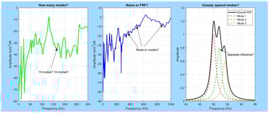 Figure 6 shows some of the main challenges in selecting peaks from FRF data during modal analysis. In the first plot on the left, the FRF has many peaks, but it’s hard to tell exactly how many real modes are present, maybe 13 or 14. This uncertainty makes it difficult to correctly identify modal parameters. In the second plot, it’s unclear whether some of the small peaks are actual modes or just noise. This can cause errors if noise is mistakenly selected as a mode during analysis.