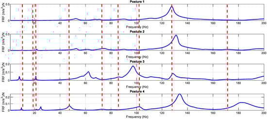 By comparing the FRFs from different postures that are close to each other, it becomes easier to identify real peaks and avoid missing important modes. Some peaks may look very small or almost hidden in one posture, but appear clearly in another. This happens because the accelerometer might be placed at a nodal point (where vibration is minimal) in one posture and at an anti-nodal point (where vibration is strong) in another [70]. Looking at multiple FRFs helps reduce the chance of mistaking noise for a real mode and gives a more complete picture of the system’s behavior (Figure 7).