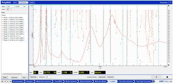 Before using the stabilization diagram, the first step in peak selection was manual inspection of the FRF curves. In this step, peaks were visually identified based on their sharpness, height, and spacing. This method was simple and useful, especially when the FRFs were clear and not too noisy. It allowed the user to focus on significant peaks that likely represent real modes quickly. However, manual selection had some disadvantages. It was time-consuming, depending on the user’s experience, and could be affected by noise or closely spaced modes, leading to errors or missed peaks [69].