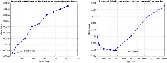 Figure 9 shows the effect of batch size and number of epochs on the mean loss using repeated 5-fold cross-validation. The results indicate that smaller batch sizes improve learning stability, with the lowest loss achieved at a batch size of 8. Larger batch sizes led to higher loss, weaker gradient updates, and reduced generalization. Similarly, the epoch analysis shows that the loss decreases steadily up to around 500 epochs, after which the model begins to overfit and the loss increases. This confirms that 500 epochs provide the best balance between underfitting and overfitting, ensuring convergence without excessive training. These results justify the choice of 500 epochs and a batch size of 8 as optimal for accurate and stable model performance.
