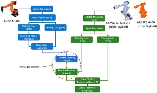 In this section, only the methodology regarding the application of transfer learning based on the pretrained neural networks of Robot A is discussed. The setup, data collection and modal parameter extraction processes for Robot B (Comau, high-payload) and Robot C (ABB, low-payload) are the same as discussed in [69]. The pretrained model was then used to train new modal parameter prediction models for Robot B and Robot C, using significantly smaller datasets. The predicted modal parameters are then used to estimate the FRFs of Robots B and C and compared with the measured FRFs.