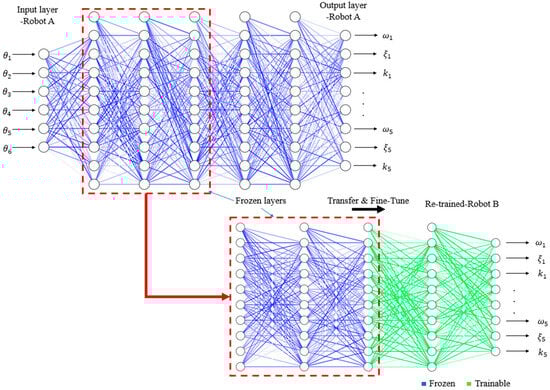 Figure 11 shows how transfer learning is used to build a deep learning model for Robot B using an already trained model from Robot A. At the top of the figure, the pretrained DNN for Robot A takes six robot joint angles as input ( to ). This model has five hidden layers. The first three hidden layers (shown in blue) are already trained and contain important information about the robot’s vibration behavior. These layers are called frozen, which means their weights do not change during training.