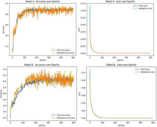 Training and validation performance of the transfer learning model for Robot A and Robot B: accuracy and loss over 500 epochs.