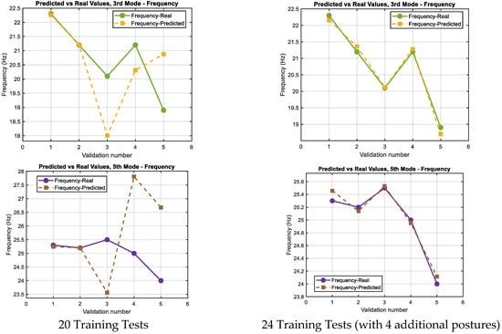 From 25 records of the Robot B datatest, 20 records were used for retraining the prediction model, and 5 were selected to evaluate the prediction accuracy. These postures were chosen to represent a range of joint configurations and to simulate a realistic low-data scenario. The model was tasked with predicting modal parameters for these five new configurations using only joint angle data as input.