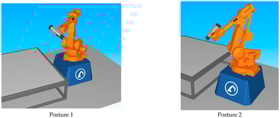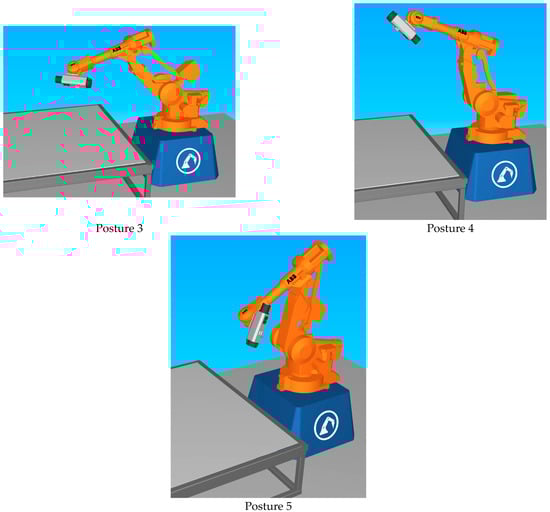 Figure 13 shows the five selected postures of the Comau robot used for prediction. These postures are visually distinct and spread across the robot’s working range. Table 3 lists the exact joint angles (in degrees) for all six joints of the robot in each posture. These postures were not part of the training data, so the results reflect the model’s ability to generalize and predict unseen configurations.