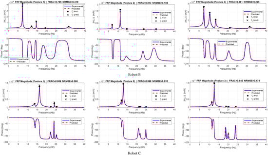 Figure 20 compares the experimental (blue) and predicted (red dashed) FRF magnitude and phase for three postures of Robot B (high-payload) and Robot C (low-payload). Across all postures, the predicted curves closely follow the measured ones in the range of 0–40 Hz. Resonance peaks occur at nearly the same frequencies and with similar amplitudes, and the phase jumps near those peaks are well reproduced. The modal-frequency markers (● = experimental, × = predicted) align closely, confirming accurate parameter estimates. Small differences appear in the high-frequency tails.