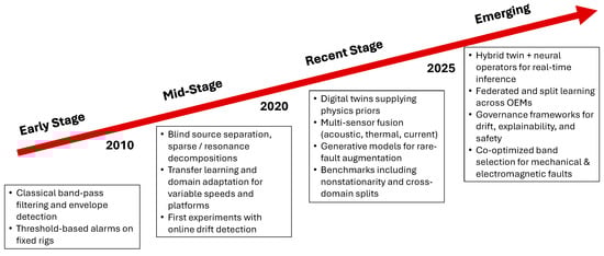 Advances in signal processing and feature engineering have improved sensitivity to weak or nonstationary faults. Adaptive demodulation, optimal band selection, and time–frequency transforms enhance signal-to-noise ratio while preserving interpretability [,]. At the fleet level, engineered indicators support health indexing and anomaly scoring, which inform service analytics and parts planning []. Artificial intelligence further strengthens PdM by learning patterns from raw or lightly processed vibration data. Supervised classifiers, deep architectures, and transfer-learning approaches complement physics-based features, improving robustness under diverse conditions [,]. Challenges remain, including nonstationary environments, sensor variability, and limited labeled failures [,,]. Addressing domain drift, improving data efficiency, and validating predictions against maintenance outcomes are essential, as is integrating predictive outputs into service workflows, thresholds, technician guidance, and logistics planning [,].