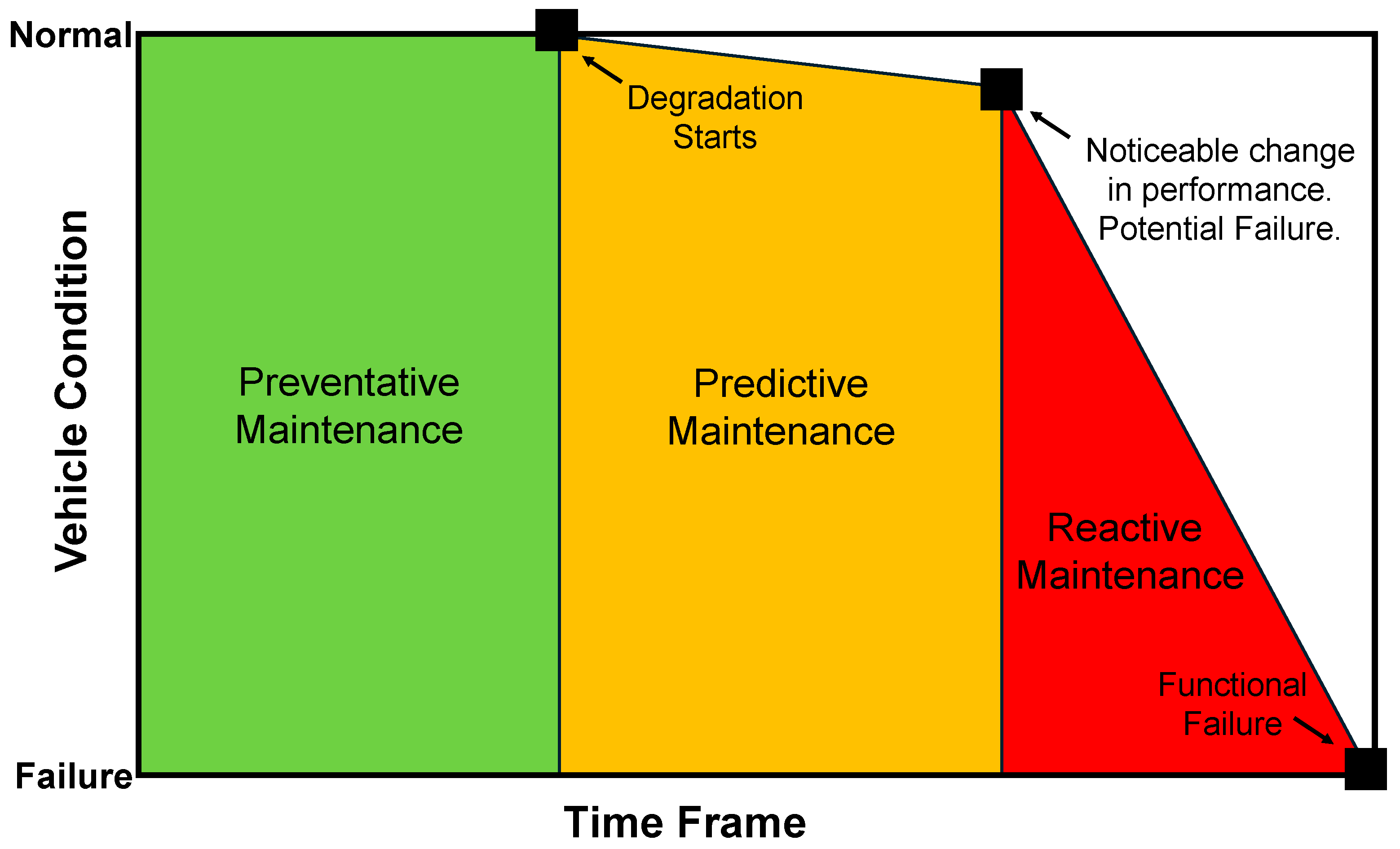 Schematic showing the relationship between preventative maintenance, predictive maintenance, and reactive maintenance as they relate to vehicle condition and time frame.