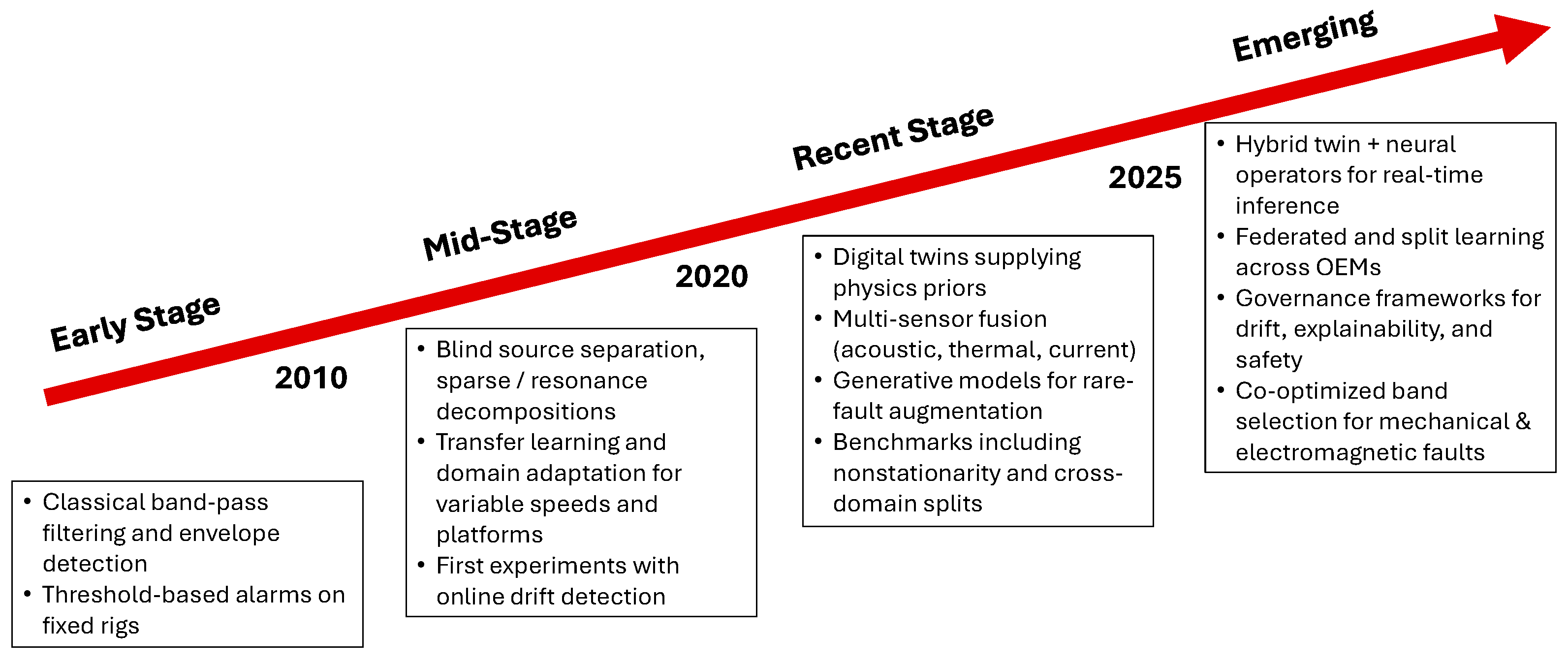 PdM ultimately depends on converting vibration features into calibrated decisions under tight computational, safety, and data-availability constraints. Automotive powertrains present nonstationary operating regimes, limited labels for rare faults, and evolving software calibrations, all of which can erode model validity. This section situates classical, hybrid, and deep learning methods within those constraints, clarifies when engineered features outperform end-to-end models, and shows how remaining-useful-life forecasting and online adaptation extend detection to planning. Establishing these roles up front enables principled trade-offs between interpretability, latency, generalization across platforms, and lifecycle maintainability in fleet deployments.