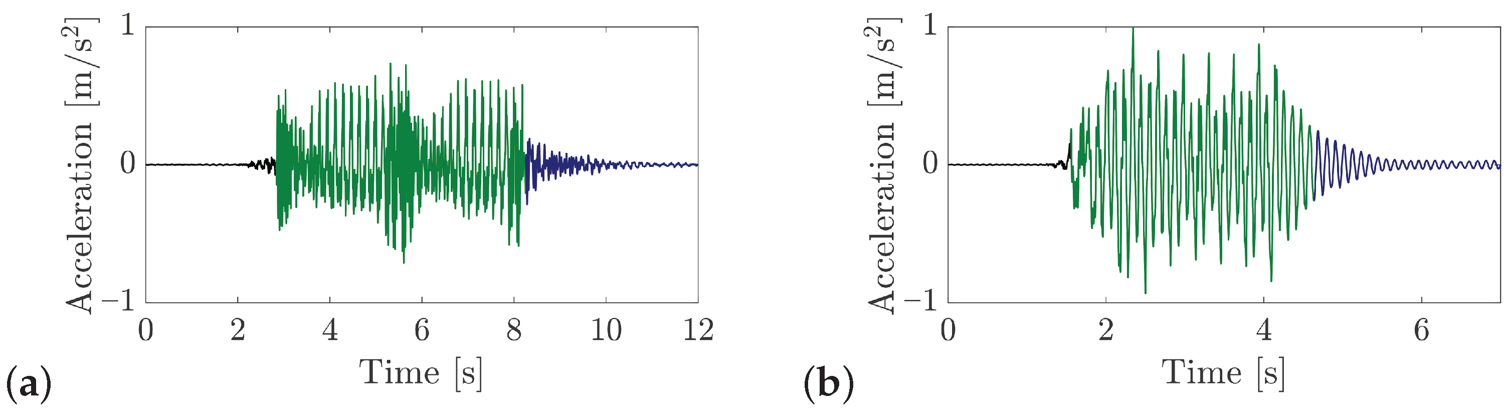 Figure 8 shows the time history responses due to Renfe S102 Duplex and Renfe S103 trains. The black trace corresponds to the recording period before the train arrival. The green line represents the time span of forced vibration. Finally, the blue line shows the free vibration, once the train has left the structure. In